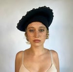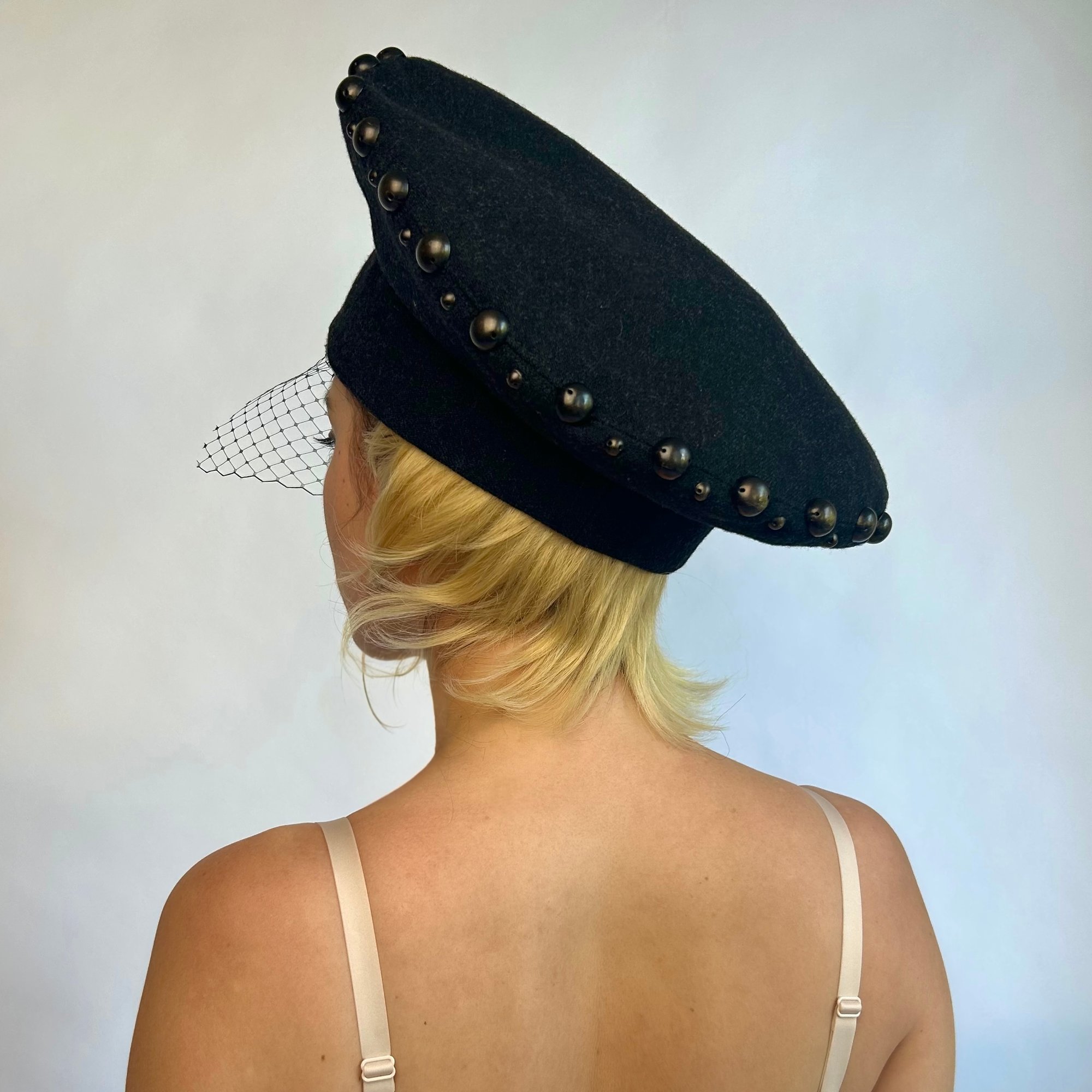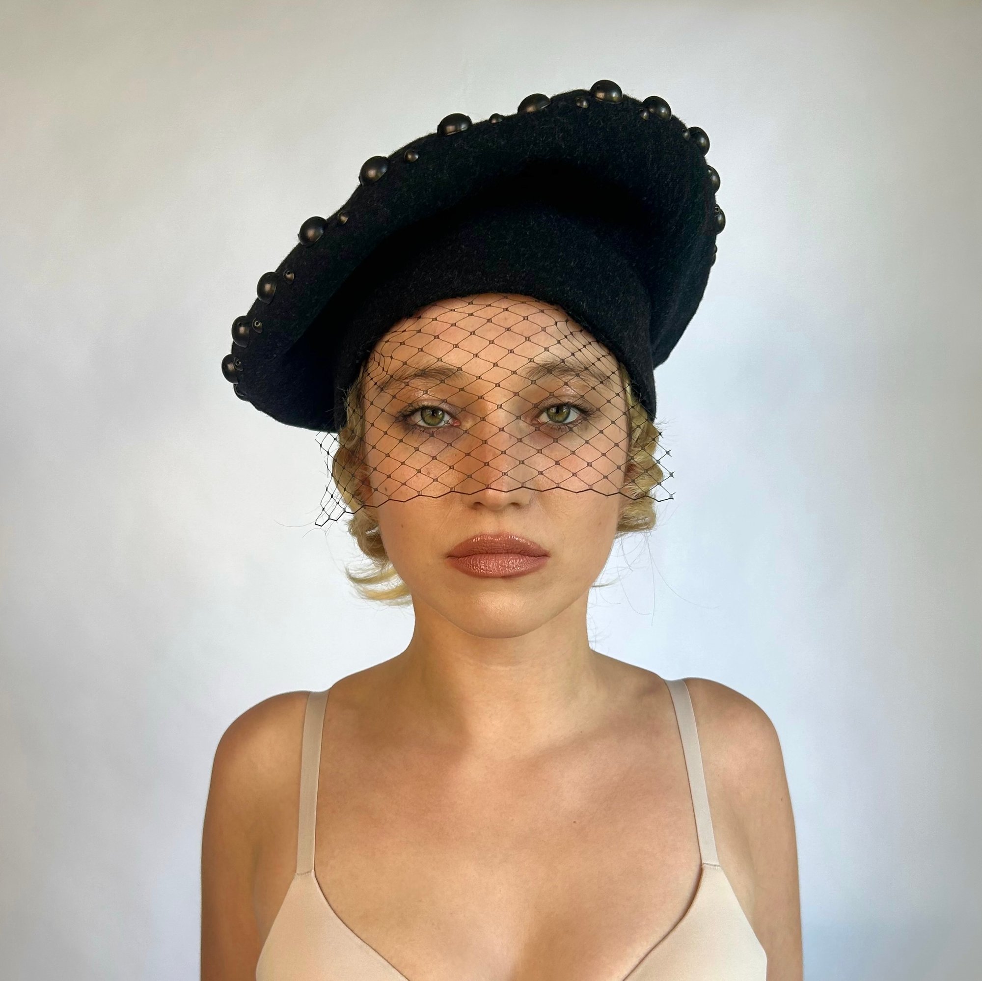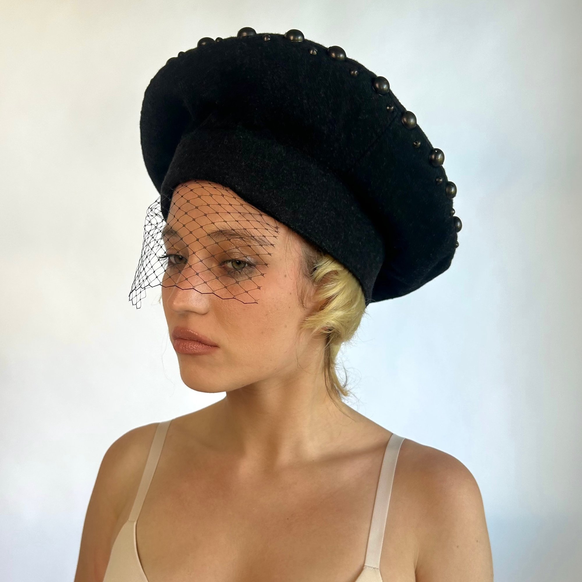 Charcoal wool floppy hat with brass stud beading and lace veil. Can be propped to either side. Smooth satin lining for a luxe finish.