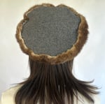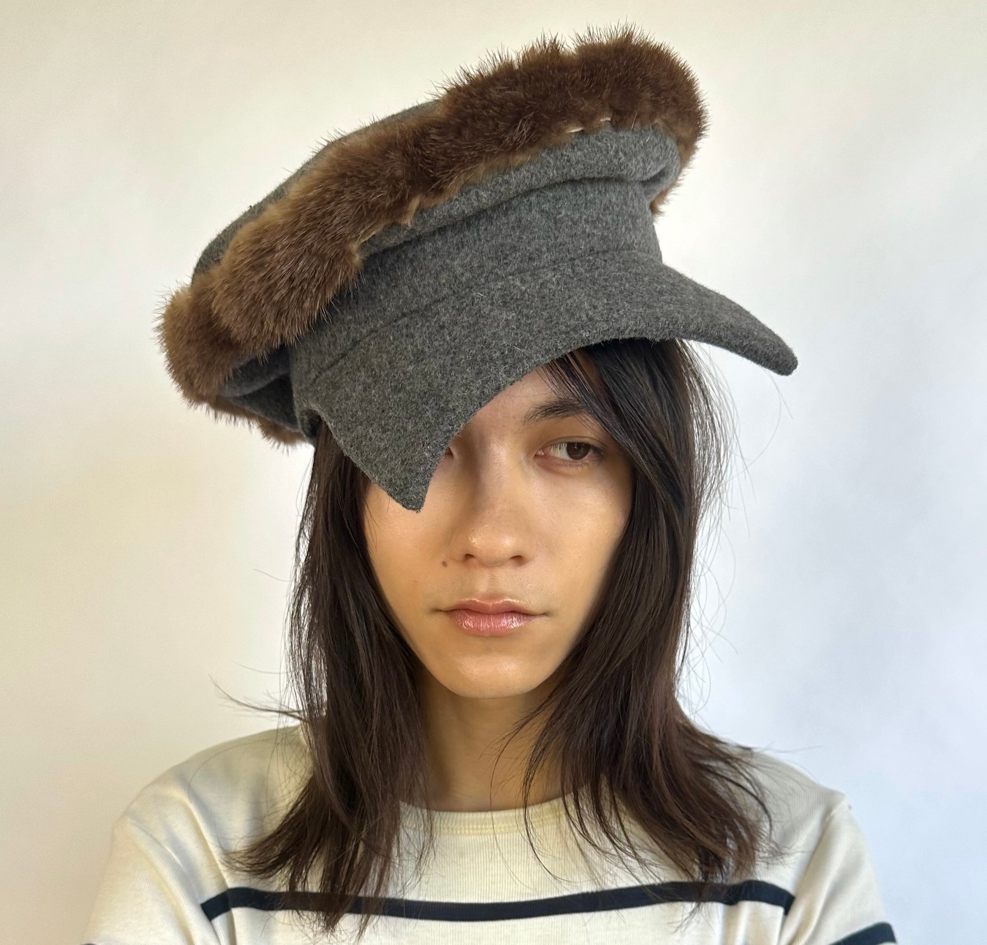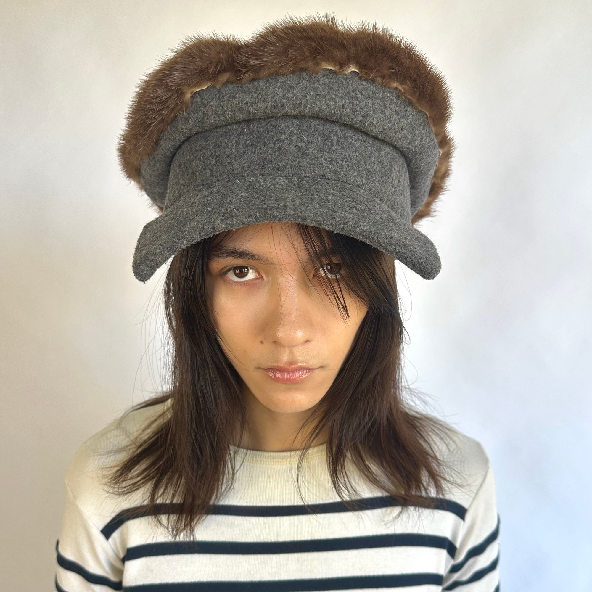Wool captain hat with concave shaped brim and real fur trim. Vintage fur from repurposed materials.