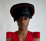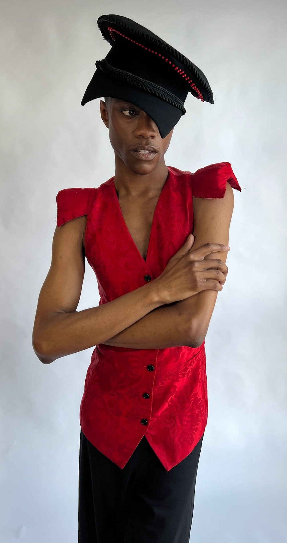 Black wool captain hat with hand-beaded design, concave shaped brim and rope trim detailing.